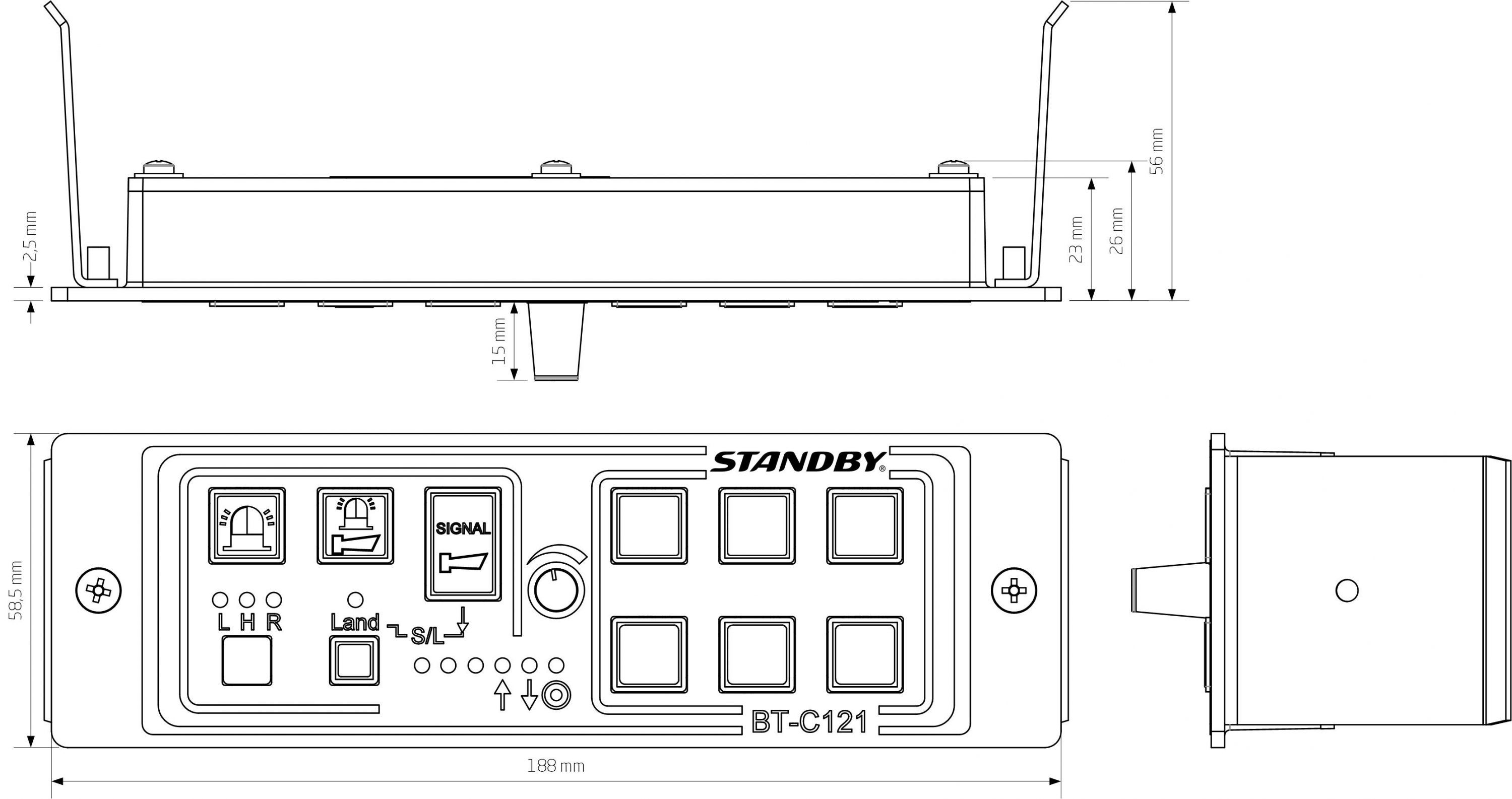 The CAN control unit BT-C 121 is suitable for installation in DIN radio slots. Individual assignment of the function keys with dependencies are implemented according to customer